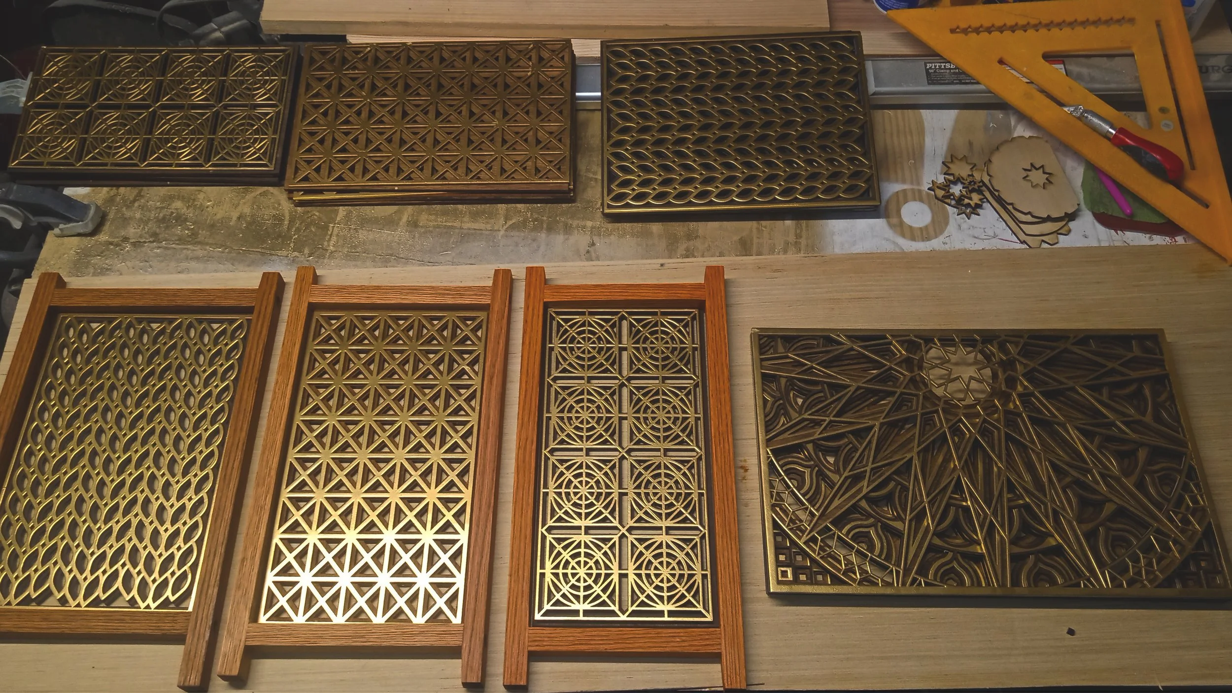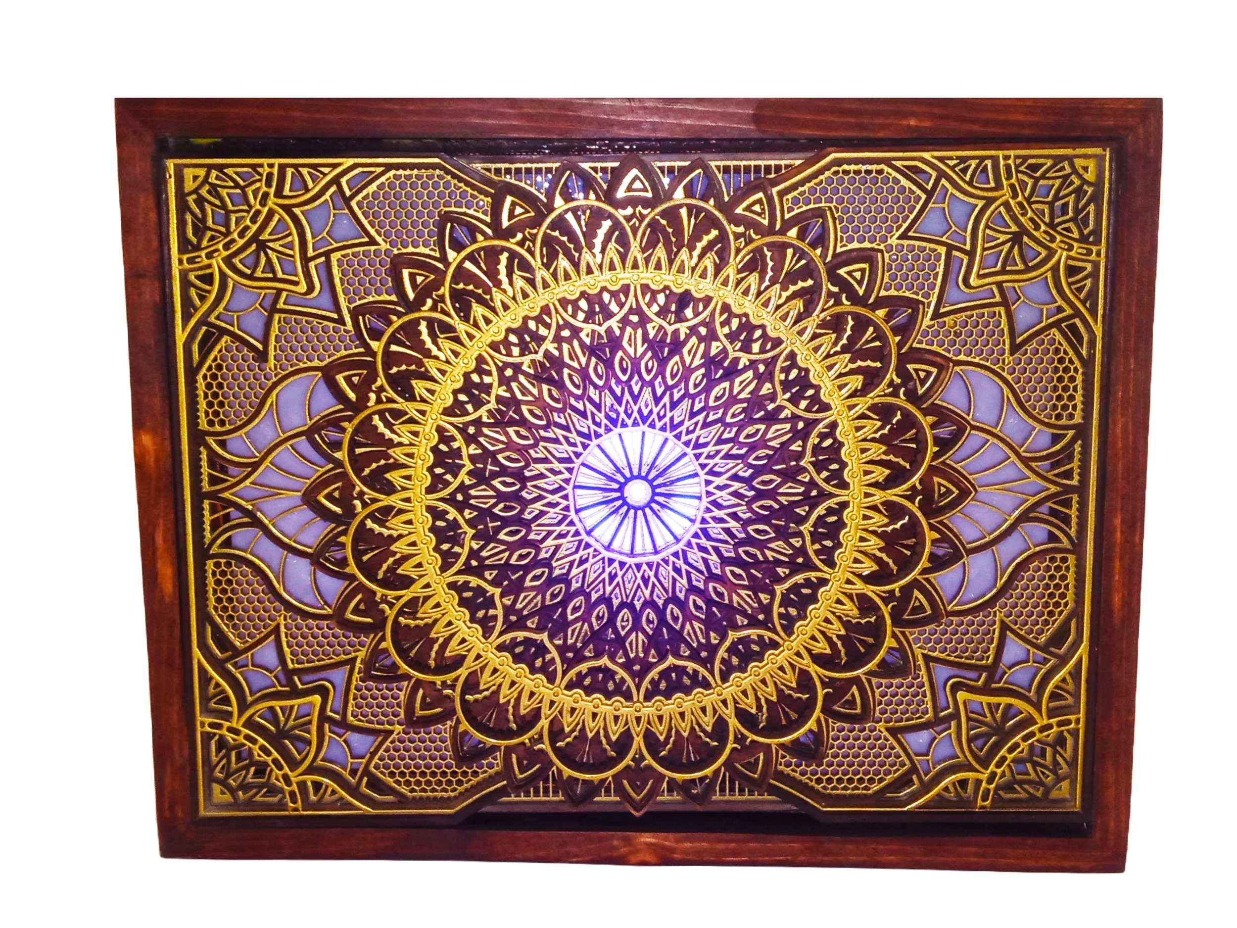 Beautifully Hand Crafted Mandala Floral Design. All natural wood, Mahogany, and Golden Oak stained, with metallic gold accents. This piece is handmade and individually assembled.