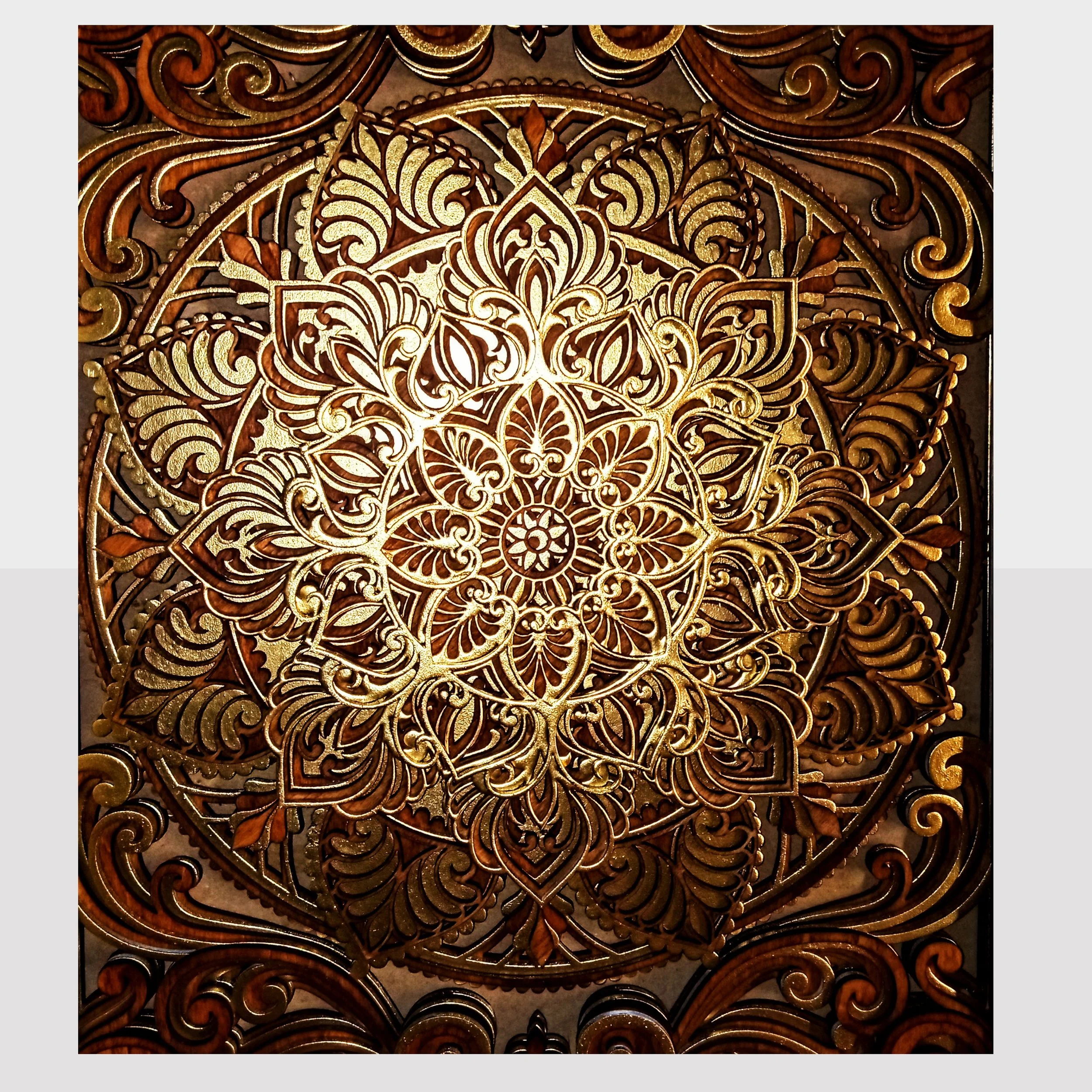Beautifully Hand-Crafted Mandala Floral Design. All natural wood, Mahogany, and Red Oak stained, with metallic gold accents. This piece is handmade and individually assembled.