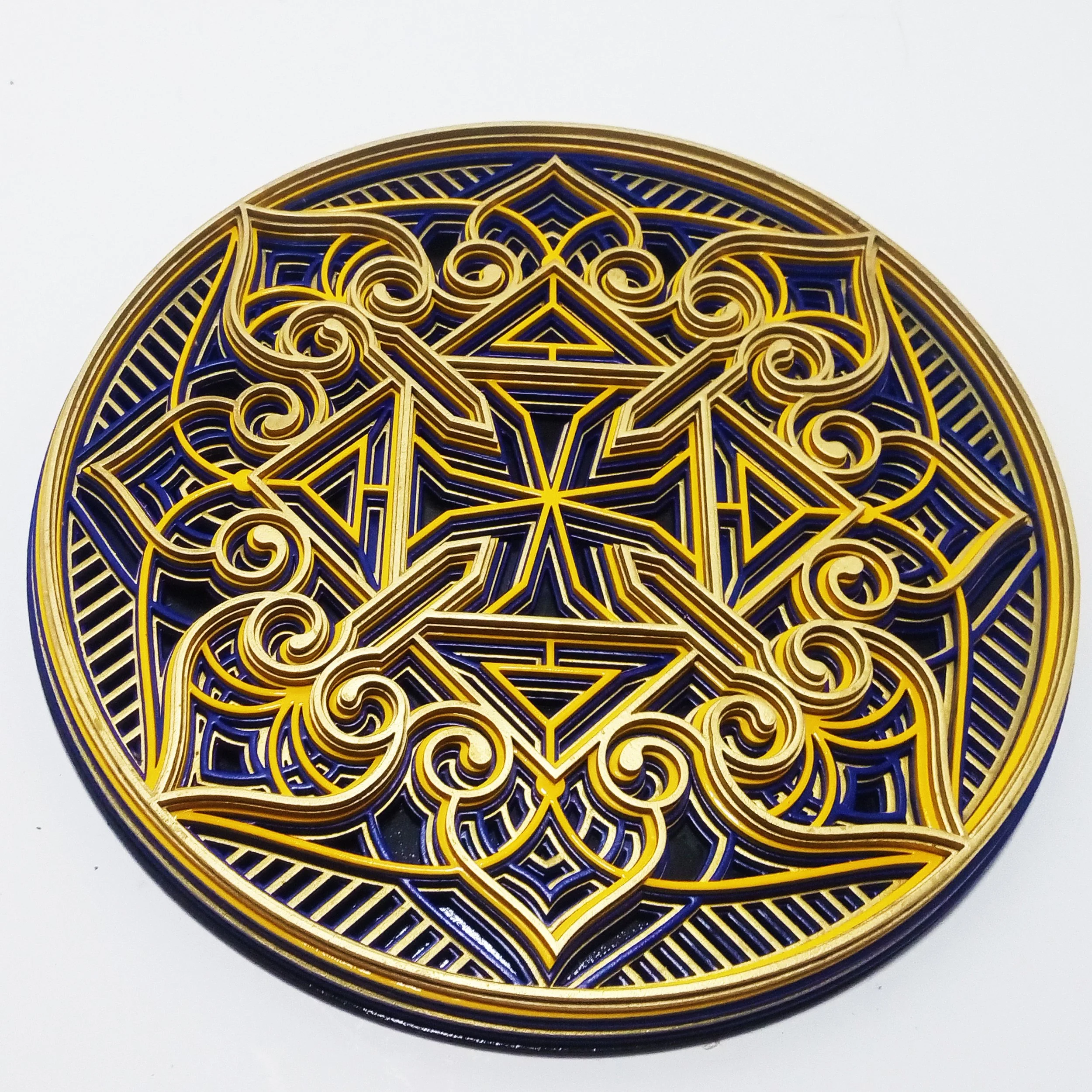 Beautifully Hand-Crafted Mandala Floral Design. All natural wood, royal blue, summer sun, and metallic gold accented handmade, and individually assembled.